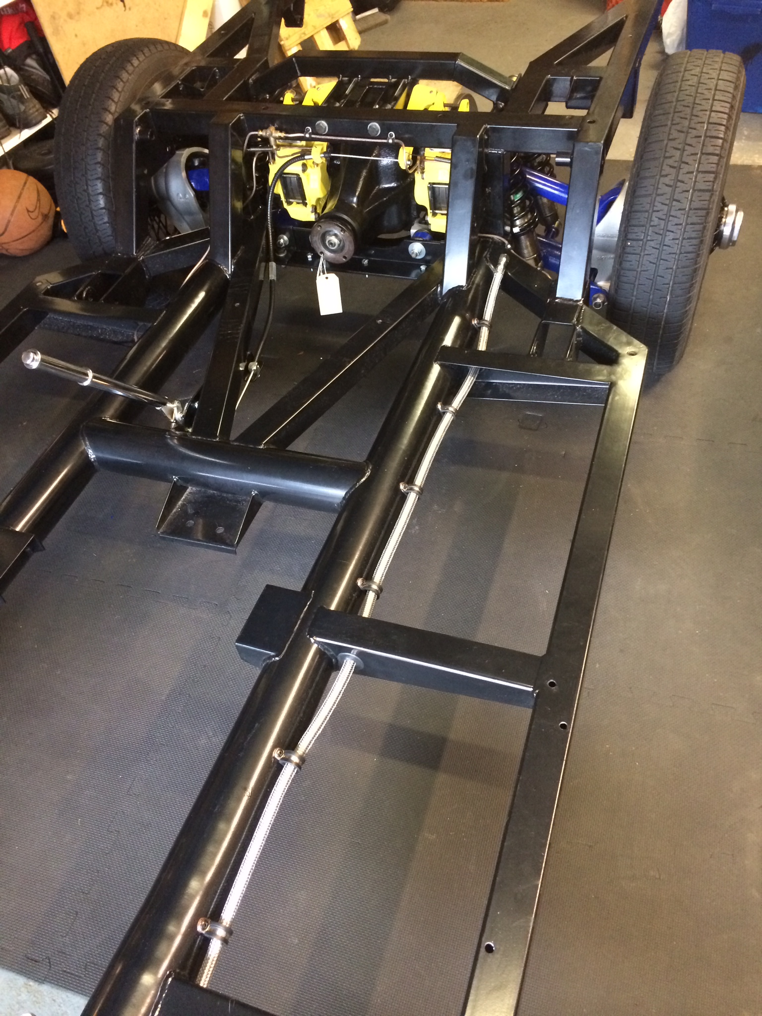 I purchased the fuel line kit from Gerry. It includes the braided line, pump and regulator. As I don’t have the body on it is easy to run the line, but I will have to wait to connect through the body and tank to finish it. I cut holes in the grommets to fit the line where it runs through the outriggers and used rubber lined stainless P Clips to attach to the chassis.