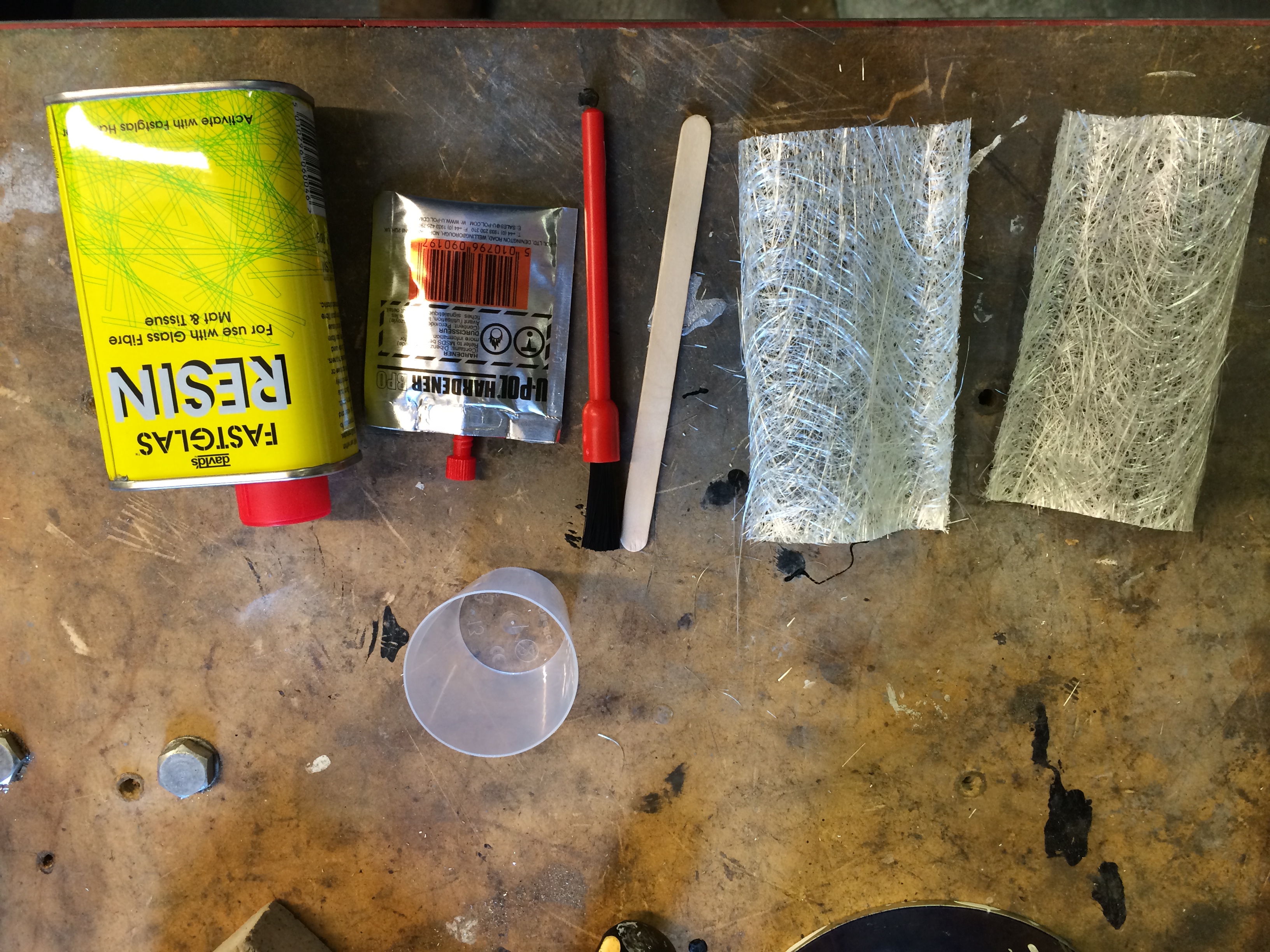 Once i had them fixed with tape I set about cutting stripes of fibre to the right size then mixing the resin. I bought a kit from Halfords, this is what was included;